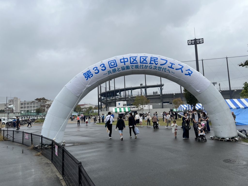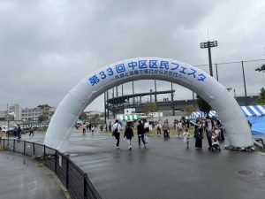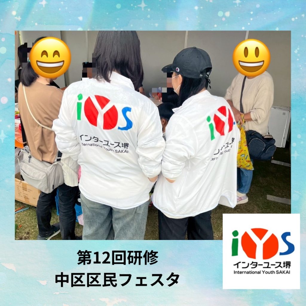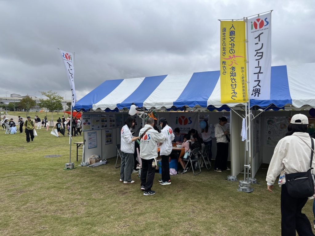 中区区民フェスタでの人権啓発活動の様子です。区民フェスタ当日は、途中で雨が降ってきましたが、インターユース堺の団員たちが来場者に積極的に声をかけて活動を行いました。自分で作成したIYS活動紹介パネルの説明や堺市人権教育推進協議会と協働してエコバック作りの補助などもしていました。