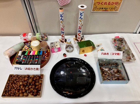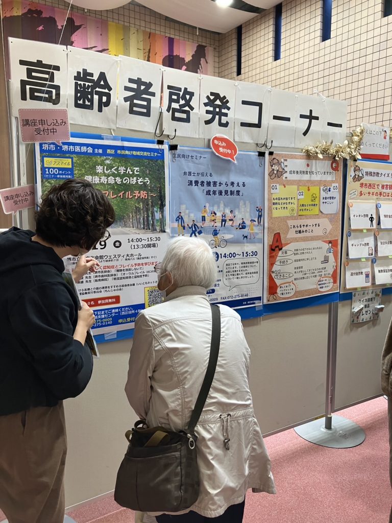 各種パネル展示や啓発チラシ・グッズの配布のほか、西区さかいボランティア連絡会グループ活動紹介、民生委員児童委員活動啓発のコーナー。こども食堂ネットワークのお知らせ。こども向けの手作りおもちゃコーナー(どんぐり工作・折り紙プレゼント)。高齢者向け特殊詐欺クイズコーナーも設置しました。