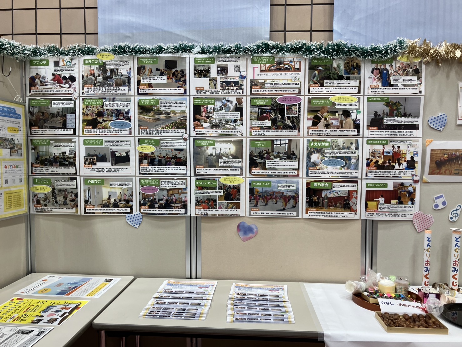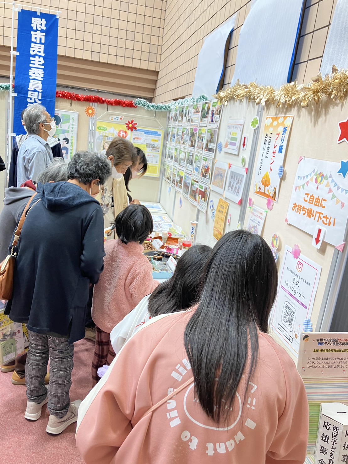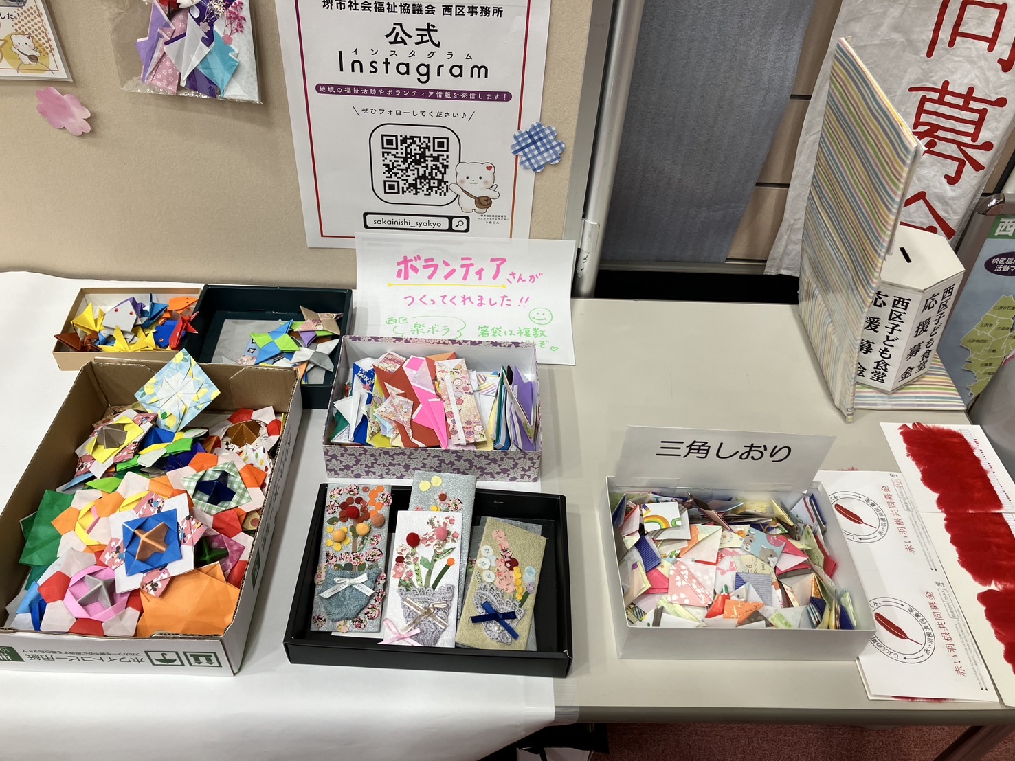 各種パネル展示や啓発チラシ・グッズの配布のほか、西区さかいボランティア連絡会グループ活動紹介、民生委員児童委員活動啓発のコーナー。こども食堂ネットワークのお知らせ。こども向けの手作りおもちゃコーナー(どんぐり工作・折り紙プレゼント)。高齢者向け特殊詐欺クイズコーナーも設置しました。