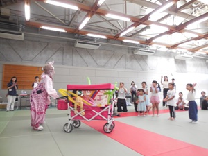 休憩をはさんだ後、後半には、お待ちかねの〝笑顔の配達屋さん″クラウン(道化師)ピエコロさんの登場です。